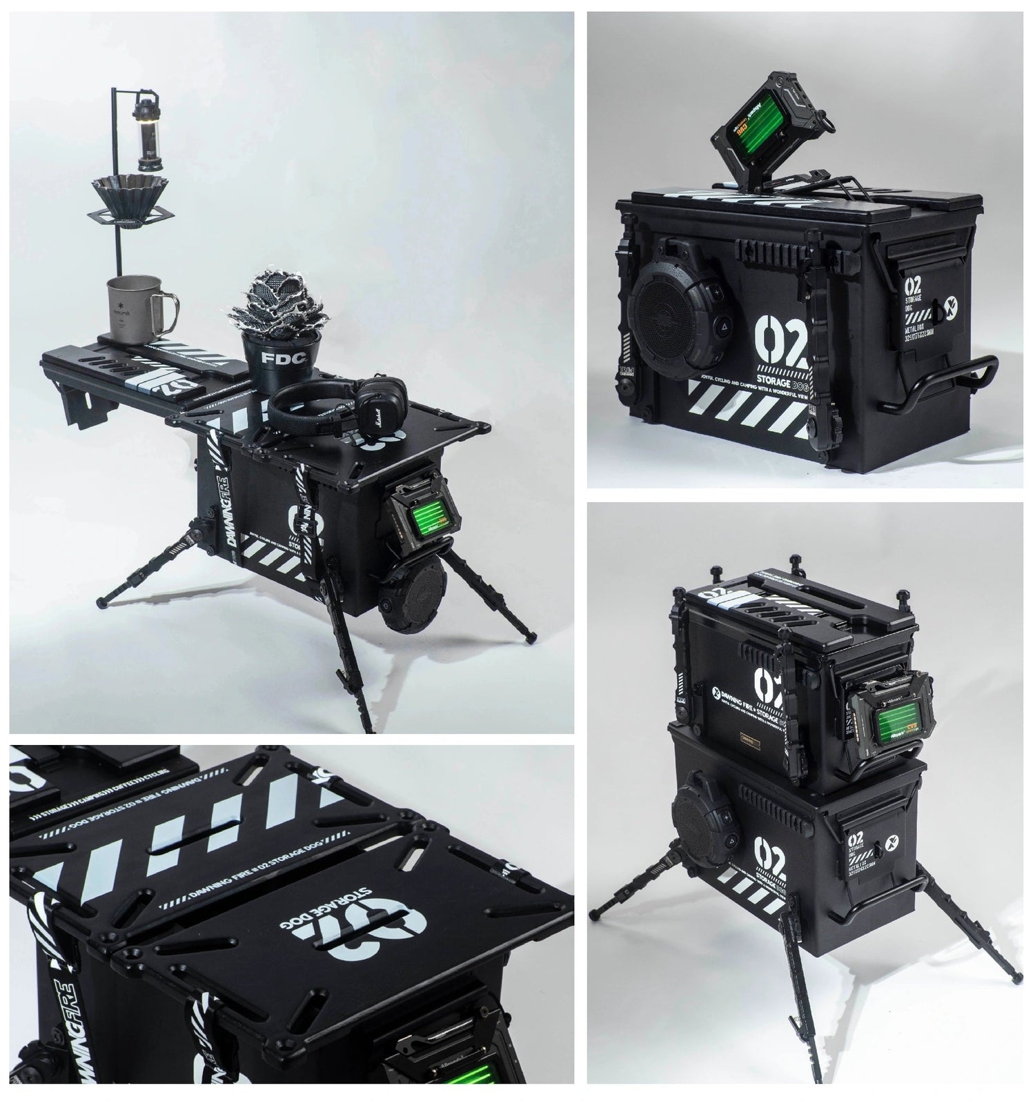 Redesigned military ammo box with adjustable tactical legs and walnut boards. Stable, functional, and stylish — your loyal “camping guard dog” waiting to be adopted.